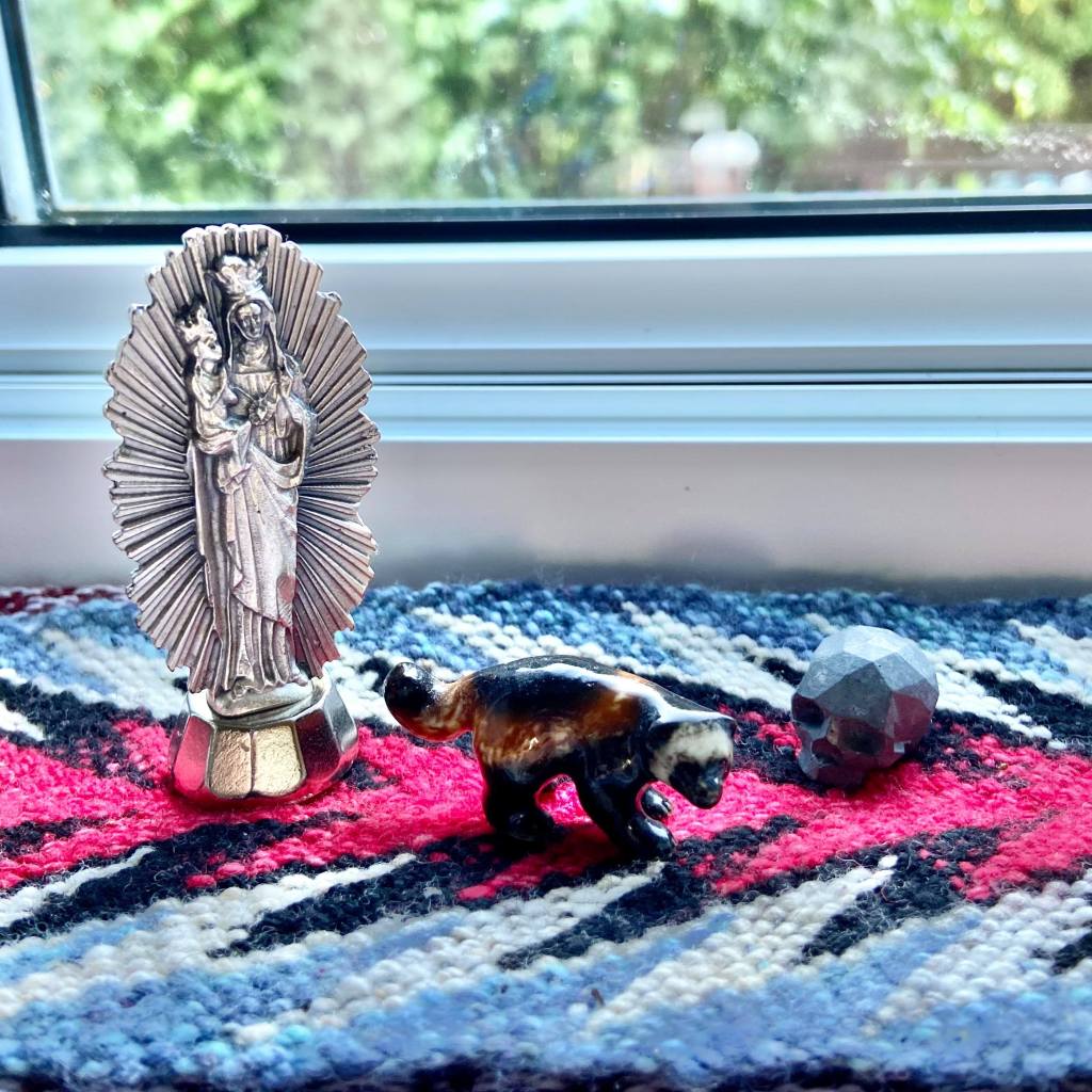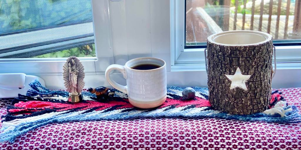 I assembled my altar little by little. I began with a representation of the wolverine, who was taking up a lot of space at that time. Then I added a skull to represent the ancestral line. Between those two figures I have featured a coffee cup. On Sundays, I always share some of my coffee with my ancestors. It is an important moment I share with them as I take the time to give thanks, where I can share my joys and sorrows. At times I may ask them advice or make some direct request of them. My daughter accompanies me in this thanksgiving when she feels the need to.