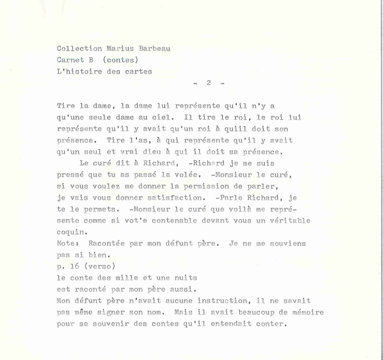 Nous sommes extrêmement reconnaissant à Marius Barbeau pour le travail immense d’enregistrement du folklore régional de plusieurs communautés et en particulier pour cette pièce. Si ce n’était de lui qui a griffonné “l’histoire des cartes”, une petite histoire que son père lui avait conté, nous ne connaîtrions pas les correspondances entre les valeurs des cartes et leur qualités divinatoires.
