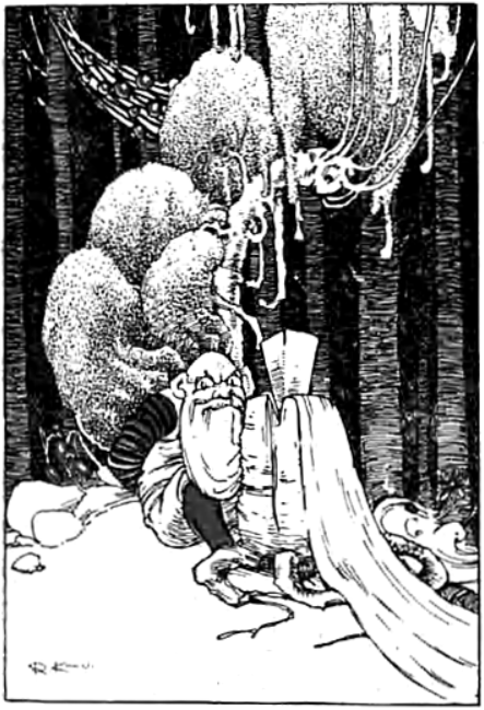 Marius Barbeau made the comparison between this Petit-bonhomme gris and the dwarves of Northern Europe, who are known to harbor secret treasures. The dwarf Alberich comes to mind with his hidden Rheingold – based on the Nibelungenlied featuring the hero Siegfried. It is our speculation that the many settlers of Acadia who came from Normandy and Picardy could have brought legends of these little treasure-guarding spirits with them. It is also quite possible that there were already indigenous beings who also protected these locations and over time came to be viewed through the European lens. We will never know the truth of the origin of these Petit-bonhomme gris, but what we do know is their presence in the Sauteux have left their mark on the people of Gaspé.