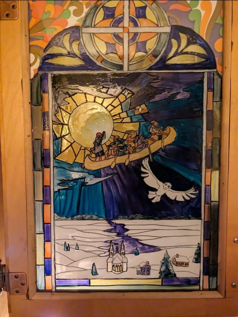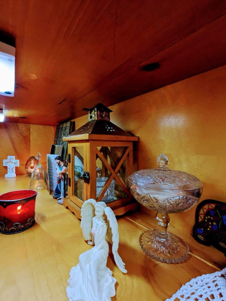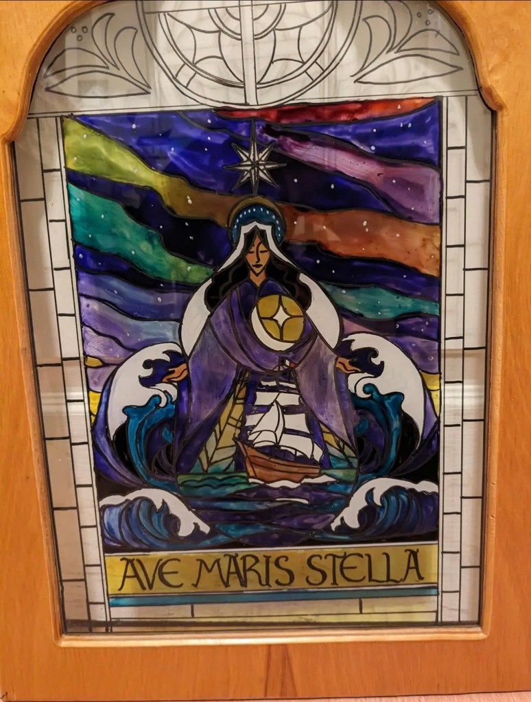 The window in the centre is one of my own works of the Virgin Mary Star of the Sea, patron saint of the Acadians. She was a good luck charm for fishermen and sailors on their sea excursions, for good fishing, kindness, and protection against storms. I drew a lot of my inspiration from my great-grandmother’s descriptions of the Magdalen Islands, and of the Northern Lights in the Islands. « Ave Maris Stella », the prayer, is also the title of the anthème of the Acadian people. In this cabinet is the tabernacle that I made from a lantern I painted myself, where I keep the host according to the rites of the church with a lantern that is always lit, except on Good Friday.