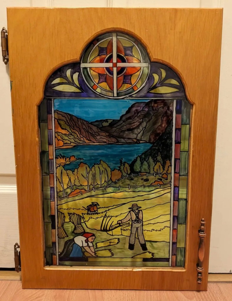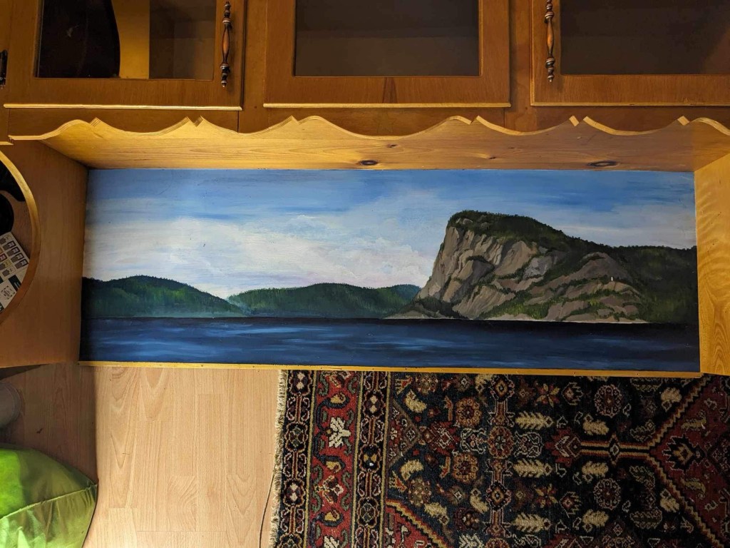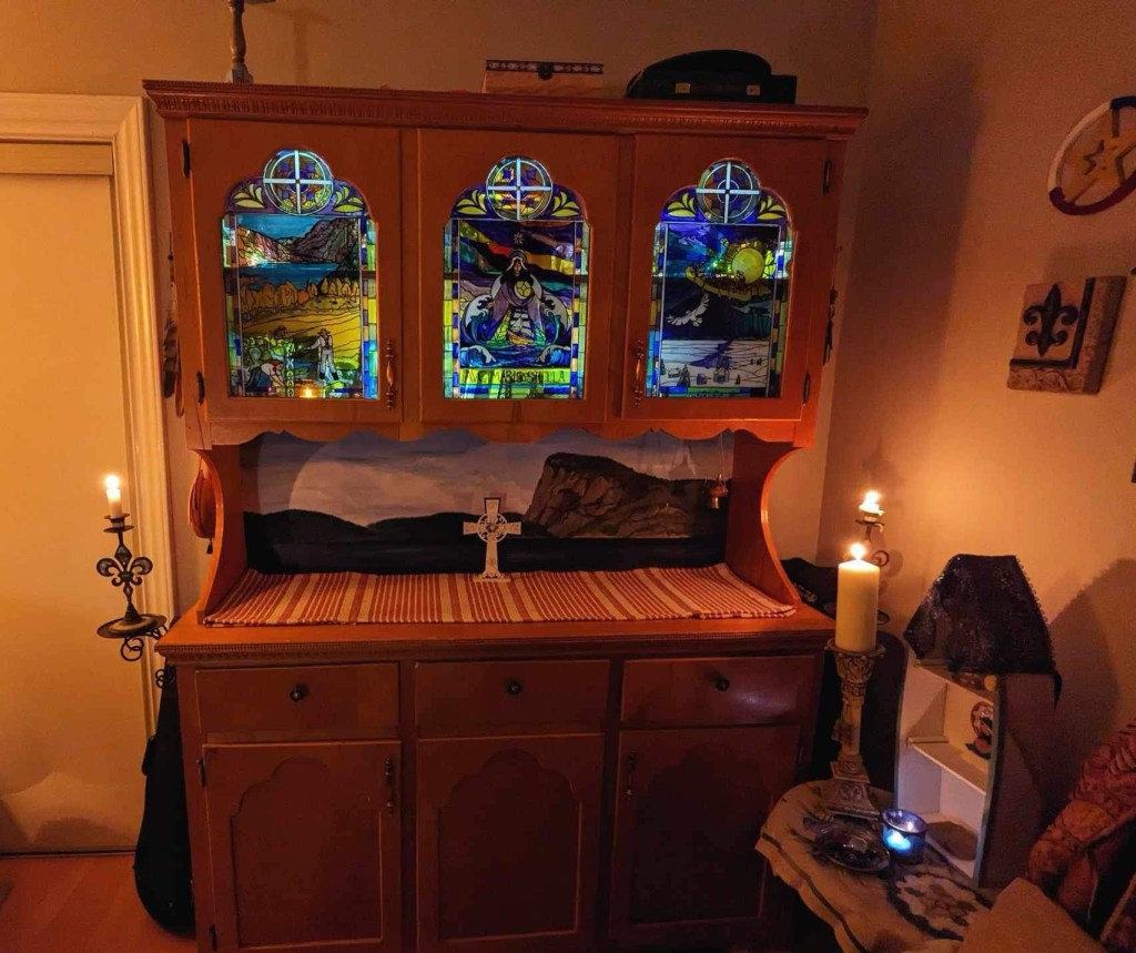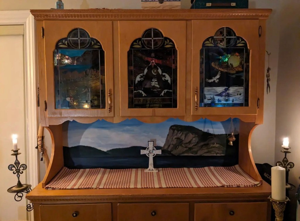 Je voulais un autel qui répondrait à mes besoins de communion de messe blanche, ainsi que les sortilèges, tout en ayant l’esprit que c’est un meuble me rappelant du Saguenay. Mes grands-parents paternels ont des meubles de bois francs, souvent fait à la main et local, et mon grand père aime sculpter le bois. J’ai eu la chance de trouver un meuble de cuisine fait à la main des années 70s sur Facebook marketplace! Tous les détails de ce dernier me rappelaient des meubles de ces chères relations. Alors, j’ai commencé à envisager l’autel de mes rêves (et toujours en progrès). J’ai commencé par l’oeuvre du cabinet, le Cap Éternité du Fjord Saguenay, ou la grande statue de la Vierge Marie veille sur les environs. Les montagnes des Laurentides du Saguenay m’ont toujours émerveillé. Et tout un paysage majestueux pour un grand autel. Ensuite, je me suis consacré aux oeuvres de vitrines. J’ai dessiné les motifs par feutre acrylique, et avec les peintures vitrine Pebeo, j’ai peint les sections. Je voulais donner l’impression des fenêtres d’église, mais avec des sujets de catholicisme populaire et du passé quotidien et culturel de mes ancêtres. Les bordures des vitrines sont inspirées par les vitrines de l’église catholique Saint-Pierre à Chéticamp.