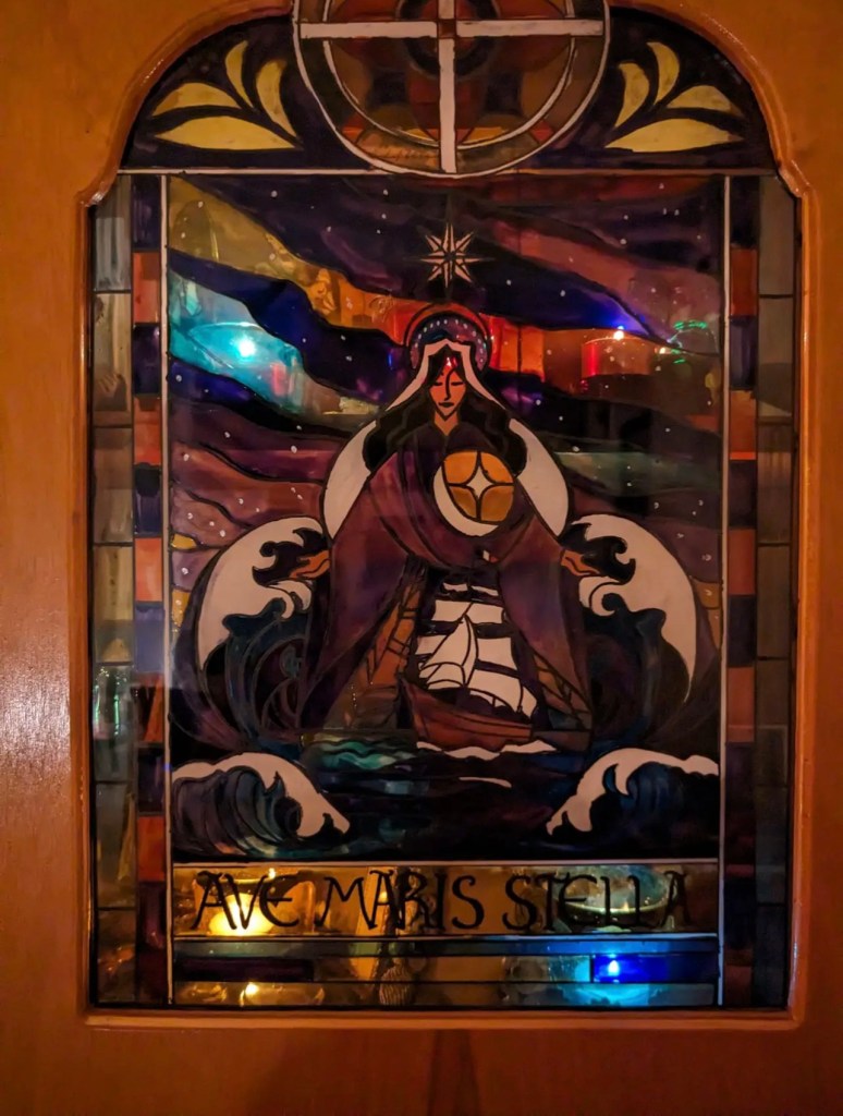 La fenêtre du centre est l’un de mes propres oeuvres de la Vierge Marie Étoile de la Mer, sainte patronne des Acadiens. Elle était un porte-chance aux pêcheurs et marins lors de leurs excursions en mer, pour la bonne pêche,la bonté, et la protection contre les tempêtes. Je me suis inspiré beaucoup des descriptions des Îles de la Madeleine parvenue par mon arrière grand-mère, et des aurores boréales aux Îles. « Ave Maris Stella », la prière, est aussi le titre de l’anthème* du peuple acadien. Dans ce cabinet se trouve le tabernacle que j’ai fait d’une lanterne peinte par moi-même, où je garde l’hostie selon les rites de l’église avec un lampion toujours allumé, sauf le Vendredi saint.