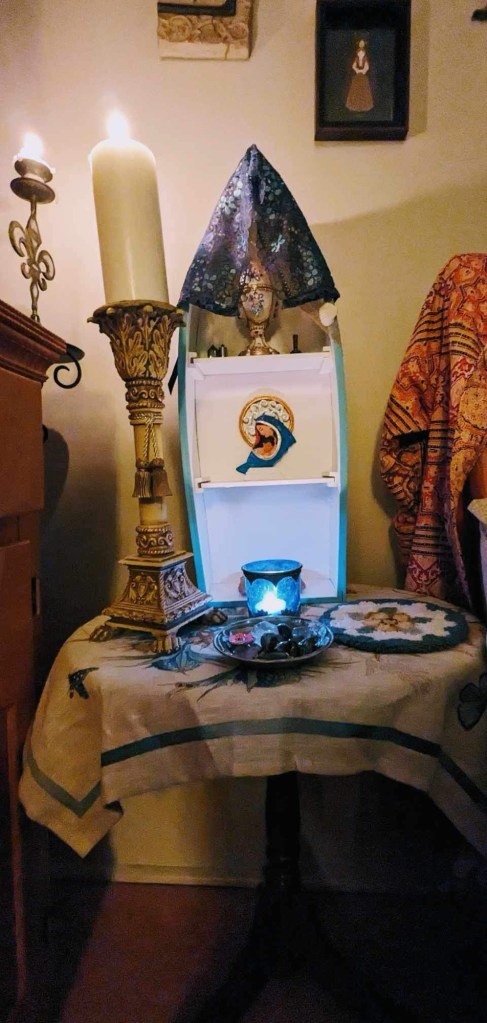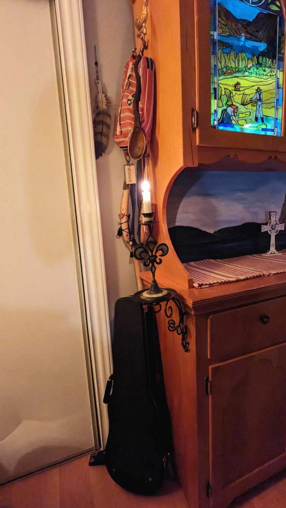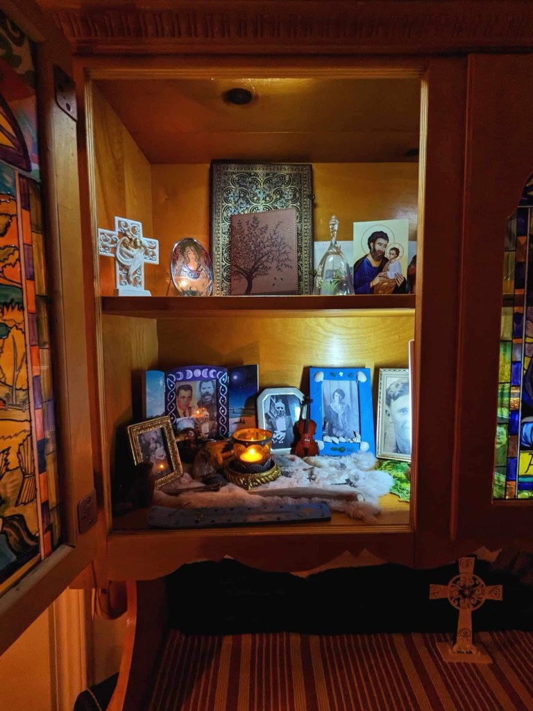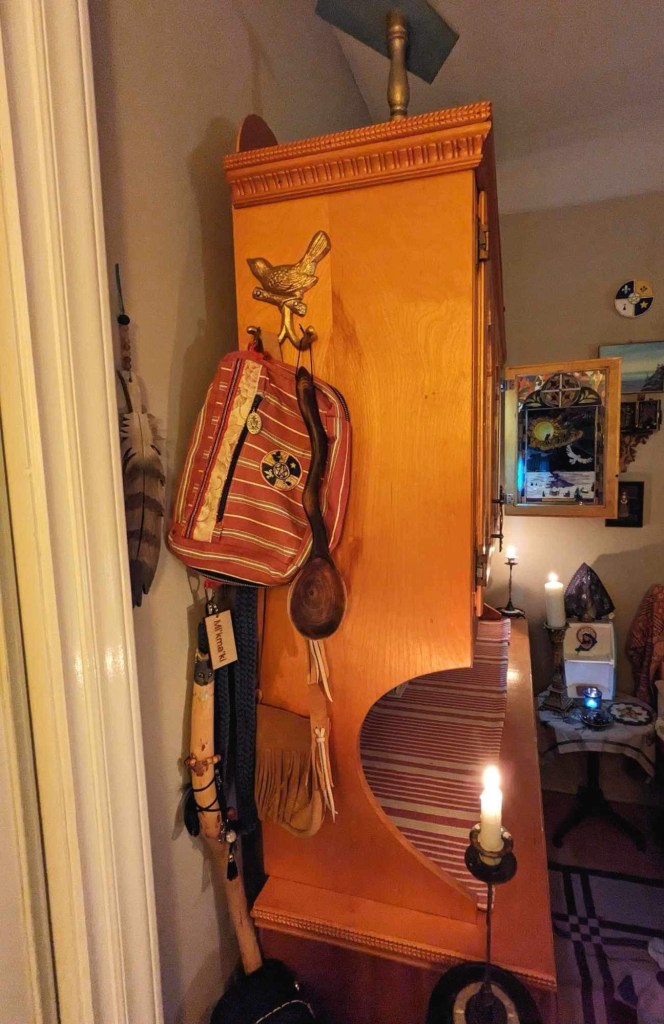 Au côté droit, j’ai une petite table pour vénérer la sainte Vierge Marie, avec une petite barque servant d’étagères pour tenir des statues, mon rosaire, et un petit tapis tissé a Chéticamp pour tenir une tasse de thé pour mes moments de repos et de méditation. L’autel a aussi des bougies de chaque côté tenu par des candélabres fleur de lys pour la Sainte Trinité. J’ai aussi une grande chandelle pascale que je bénis à chaque Pâque selon les coutumes de l’église, allumée lors de chaque rite. Accoté au côté gauche est mon bâton de marche et de rite, « Coureur des loups » que mon grand-père m’a sculptés il y a 15 ans. Je l’utilise comme une extension de moi-même et comme amplificateur de magie. Je vais toujours dans les bois avec. J’ai aussi une ceinture fléchée en laine au motif d’Assomption, créé par Etchiboy, un artiste métis. Je le porte lors de mes rites et de mes excursions boisés.
