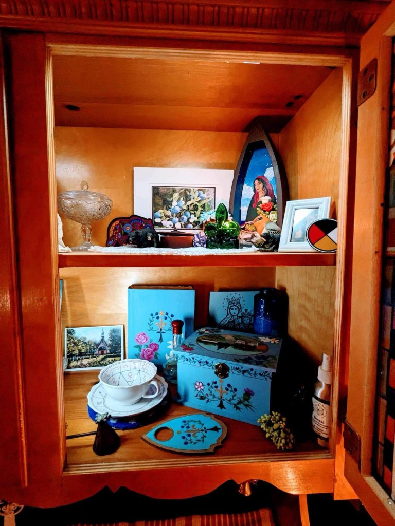 The third window was actually inspired by your blog and your article on the Chasse galerie! You’re right, the Devil is always there to play a trick or take you on a wild journey, and the story of the Chasse galerie is enchanting. What’s more, my logging and voyageurs ancestors are certainly represented there through the window too. Some voyageurs of days gone by made offerings to the great lakes on their journeys to the lands above. In this cabinet is an altar to Sainte Anne, patron saint of travellers and religious knowledge. Some of the Algonquin peoples of eastern Canada consider Sainte Anne to be the Grandmother in their own Catholic cosmologies, so I also keep my jewellery from the Ilnu museum in Mashteuiatsh to pay homage to my distant Ilnu ancestors. I also keep my box of herbs, my Bible where I write passages and spells in the margins, and my cup of tea for reading the leaves.
